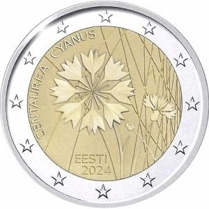 Estland 2024 in UNC kwaliteit. De waarde van munt is 2 Euro en het thema is dat de korenbloem een prachtige blauwe kleur heeft en zoals de naam aan geeft dat deze tussen het graan staat.