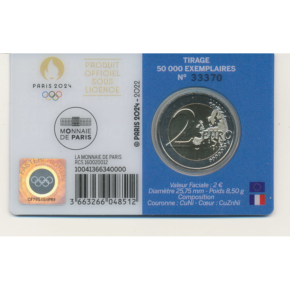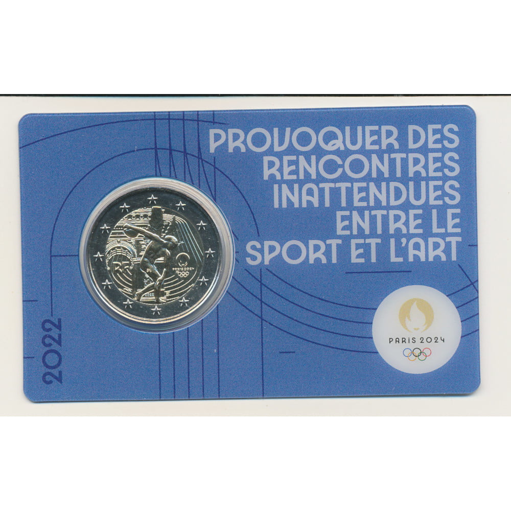 Frankrijk 2022 in UNC kwaliteit. De waarde van de munt is 2 Euro in Coincard kleur blauw en het thema is uitgegeven voor de Olympische spelen jaar 2024 in Parijs.