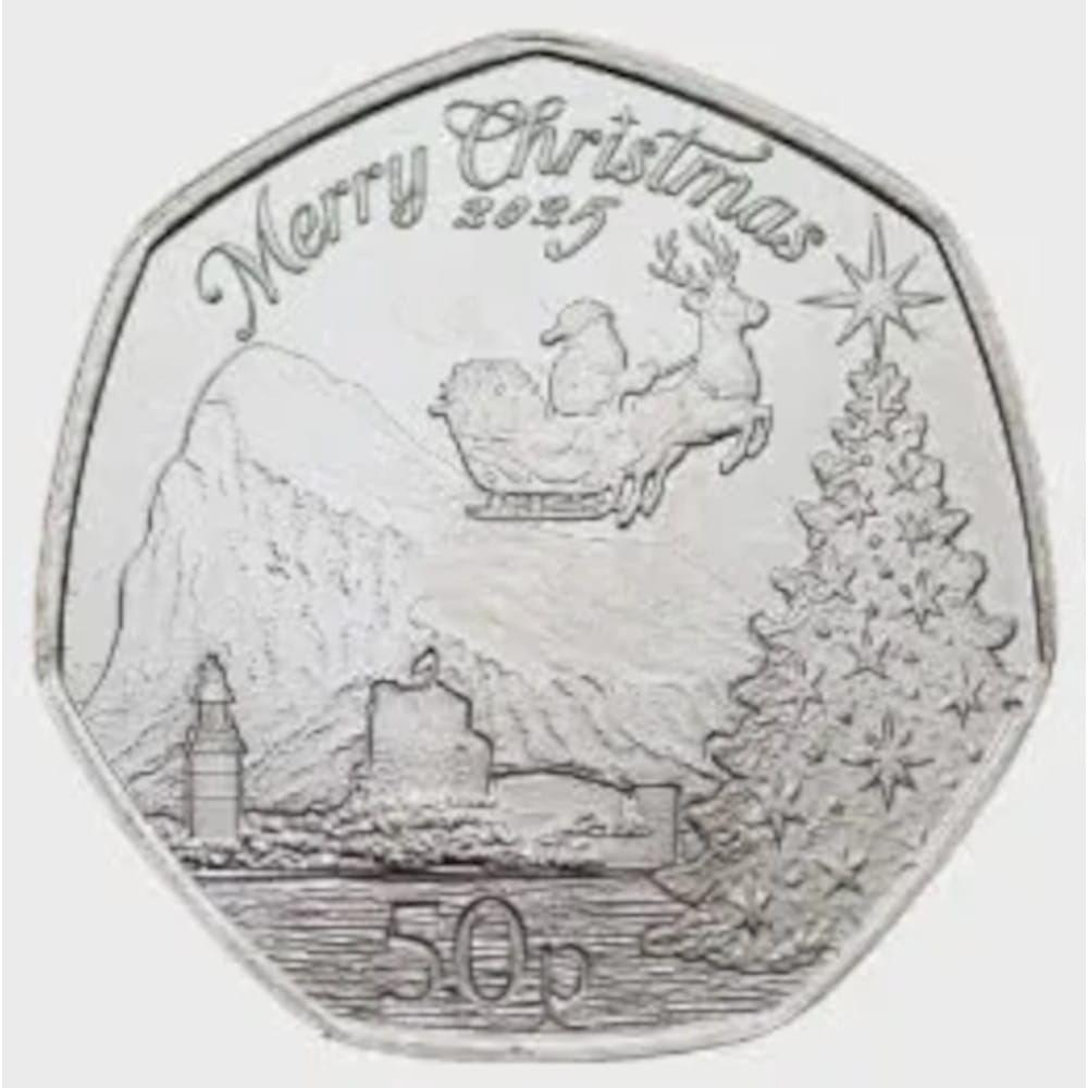 Gibraltar 2025 in UNC kwaliteit. De waarde van munt is 50 Pence en het thema is dat elk jaar een munt wordt uitgegeven van Vrolijk Kerstmis.