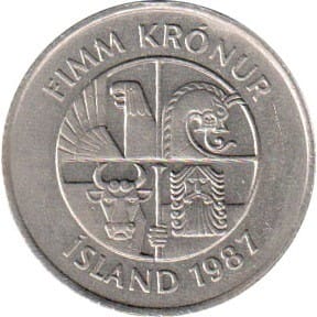 IJsland 1996 in UNC kwaliteit. De waarde van de munt is 5 Kronur en het thema is een stel Dolfijnen afgebeeld op de munt.