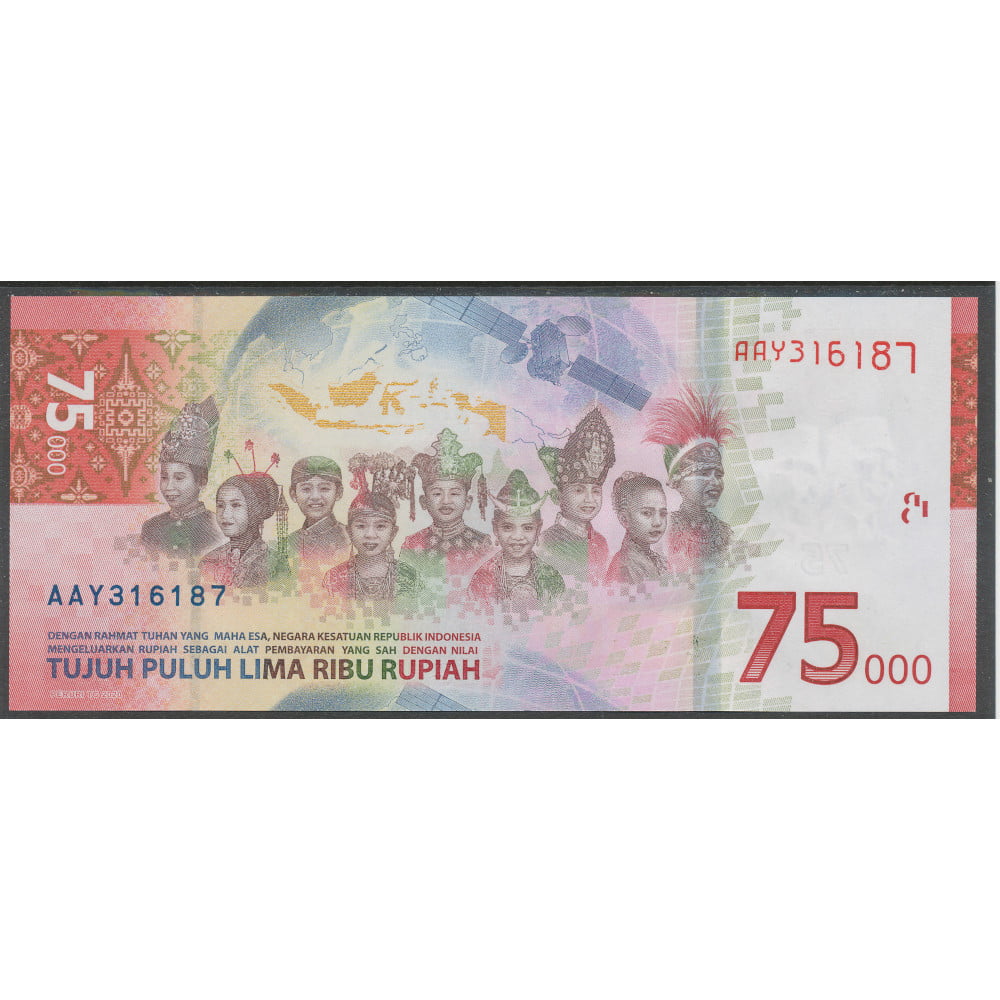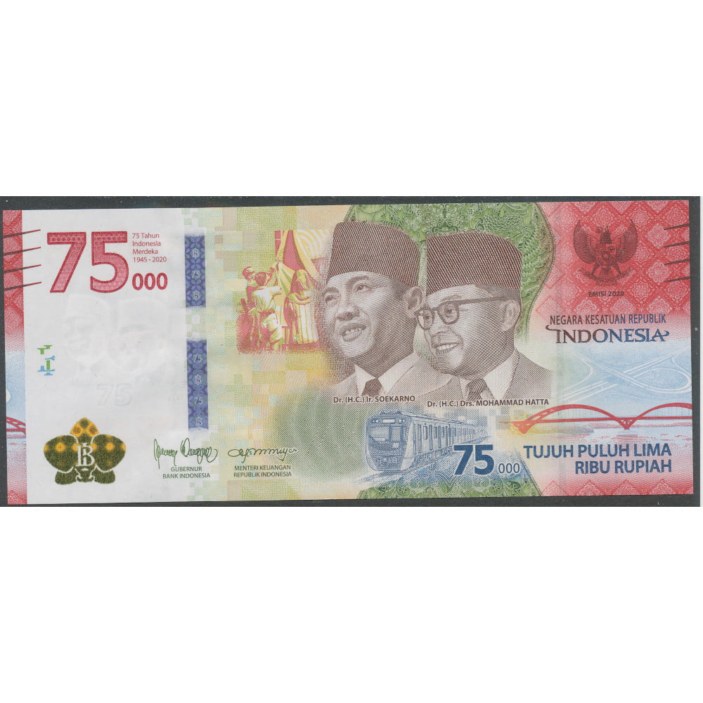 Indonesië 2020 in UNC kwaliteit. De waarde van het bankbiljet is 75000 roepia en het thema is dat voor het eerst een Bankbiljet dat herdenkt dat Indonesië 75 jaar bestaat het zijn altijd munten geweest als er wat te herdenken is.