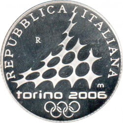 Italië 2005 in PROOF kwaliteit. De waarde van deze zilveren munt is 5 Euro en het thema is XX Olympische Winterspelen 2006 in Turijn