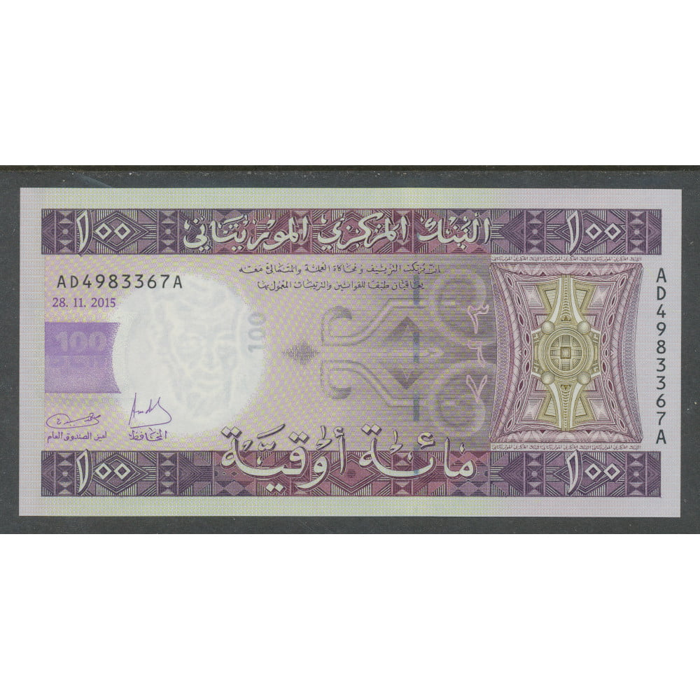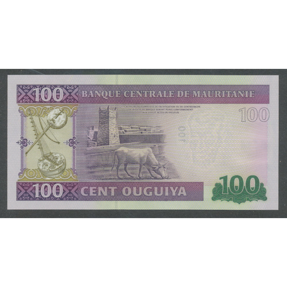 Mauritanië 2015 in UNC kwaliteit. De waarde van het bankbiljet is 100 Ouguiya en het thema is dat men Landbouw met Koeien en Stieren bedrijven.