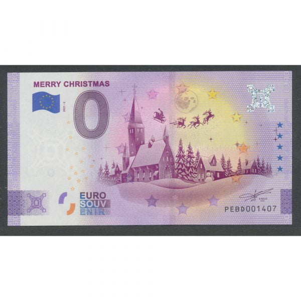 Uitgifte 22 / 50 nieuw 0 Eurobiljet van Nederland jaar 2021 met de UNC kwaliteit. De waarde is 0 Euro en de voorstelling van de valuta is een winterlandschap met als titel Merry Christmas.