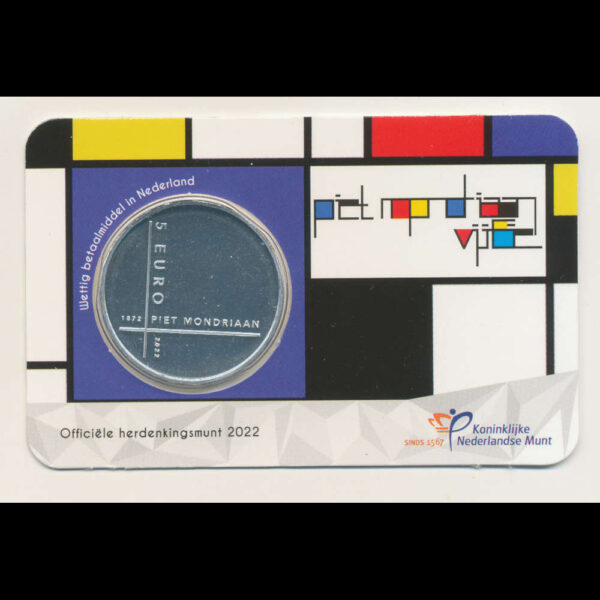 Uitgifte 2 / 10 nieuwe munt in Coincard van Nederland 2022 met de UNC kwaliteit. De waarde is 5 Euro en de voorstelling van de valuta is 150 jaar Piet Mondriaan