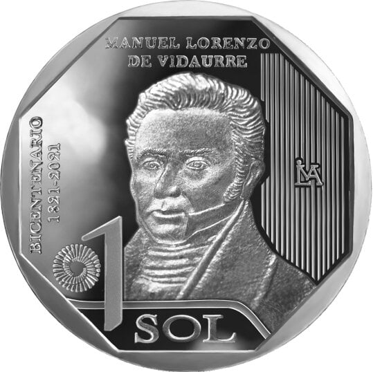 Peru 2022 UNC kwaliteit. De waarde van de munt is 1 Sol en het thema is dat Politicus Manuel Lorenzo de Vidaurre Minister van Buitenlandse zaken van Peru was.