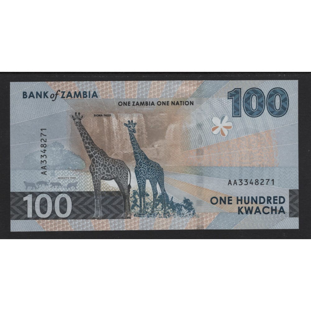 Zambia 2024 UNC kwaliteit. De waarde van het bankbiljet is 100 Kwacha en het thema is een Visarend en de Sioma-Watervallen op dit bankbiljet.
